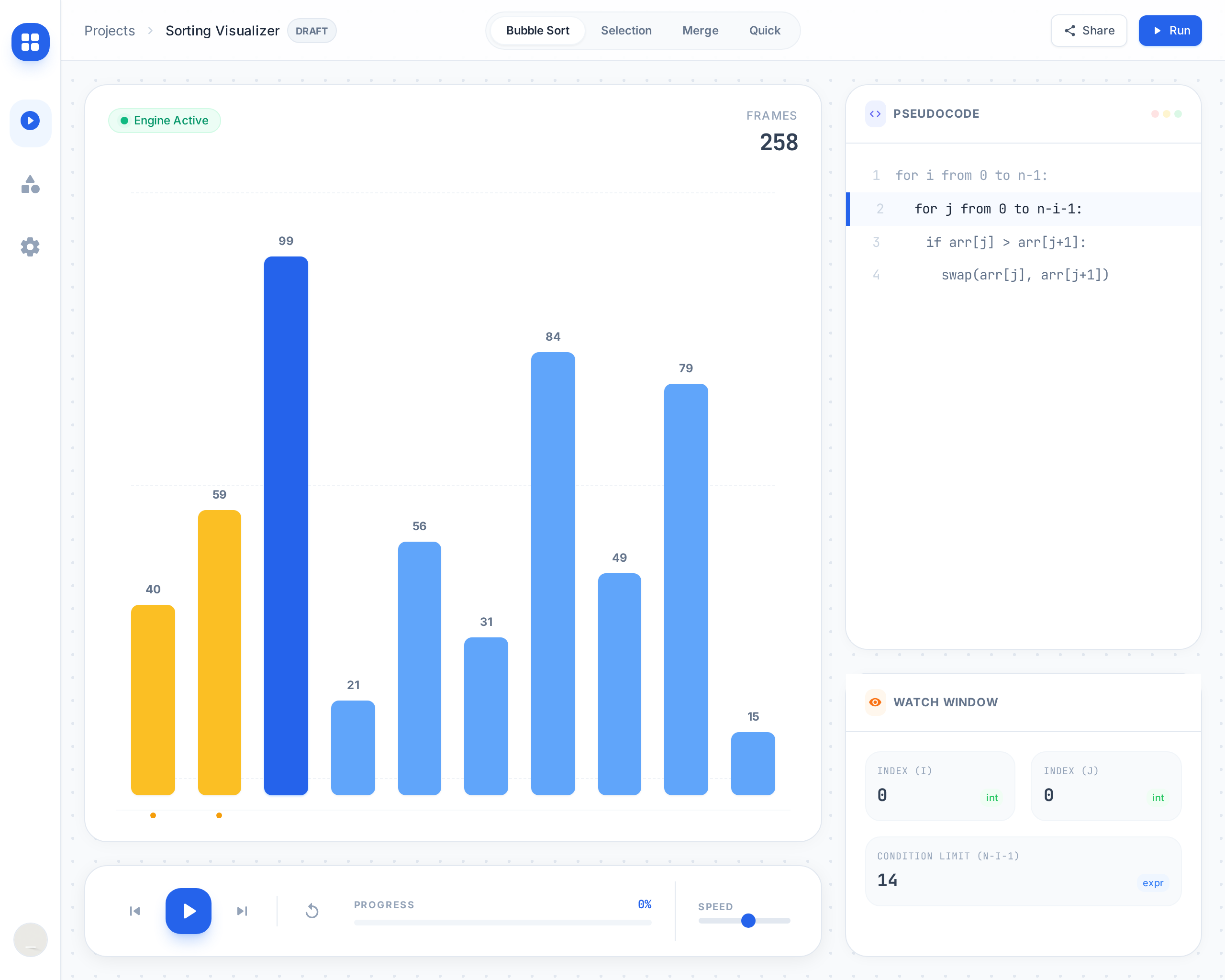 Stop struggling with abstract concepts. Our interactive canvas brings sorting, searching, and data structures to life.